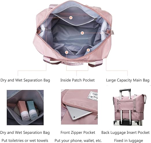 - تحتوي الحقيبة على جيبين بسوستة وجيبين داخليين وجيب لفصل العناصر المبللة عن الجافة. توفر مساحة كبيرة تكفي للرحلات القصيرة ويمكنها استيعاب ملابس تدوم لحوالي 3-5 أيام.