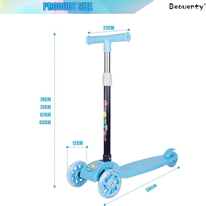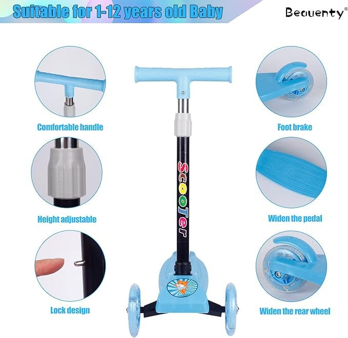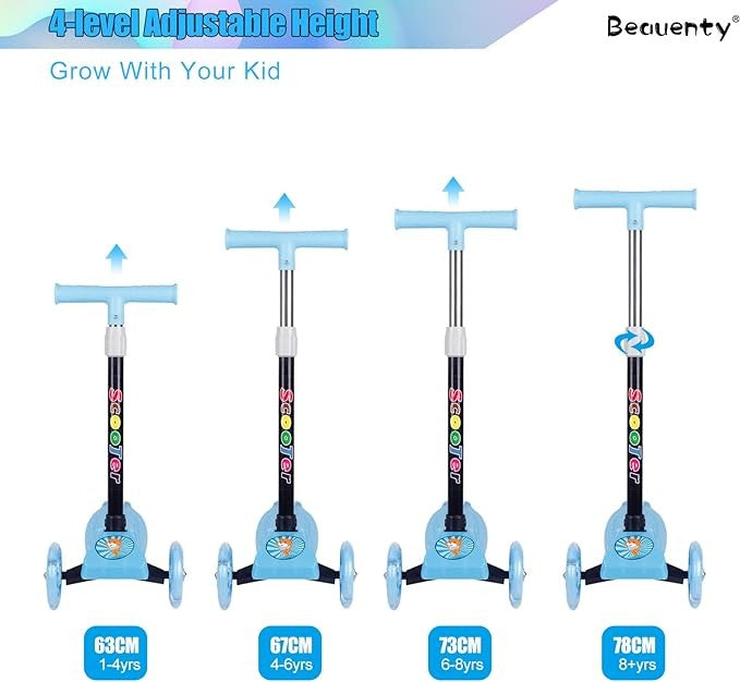 قابلية التعديل: يوفر سكوتر بيونتي للأطفال إمكانية تعديل الارتفاع ليتناسب مع نمو الطفل، مما يجعله مثاليًا للأطفال من عمر 2 إلى 8 سنوات. هذا يضمن استخدامًا طويل الأمد ويسمح للطفل بالاستمتاع بالسكوتر لفترة أطول.