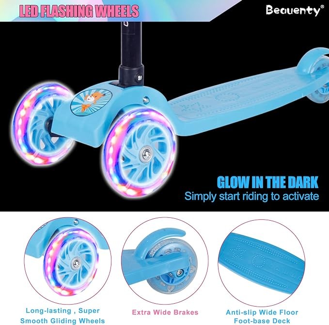 عجلات LED المضيئة: تضيف العجلات المضيئة LED عنصرًا إضافيًا من المرح والإثارة أثناء استخدام الطفل للسكوتر، وتجعله مرئيًا بشكل أفضل في الظلام، مما يعزز السلامة والتسلية أثناء اللعب.