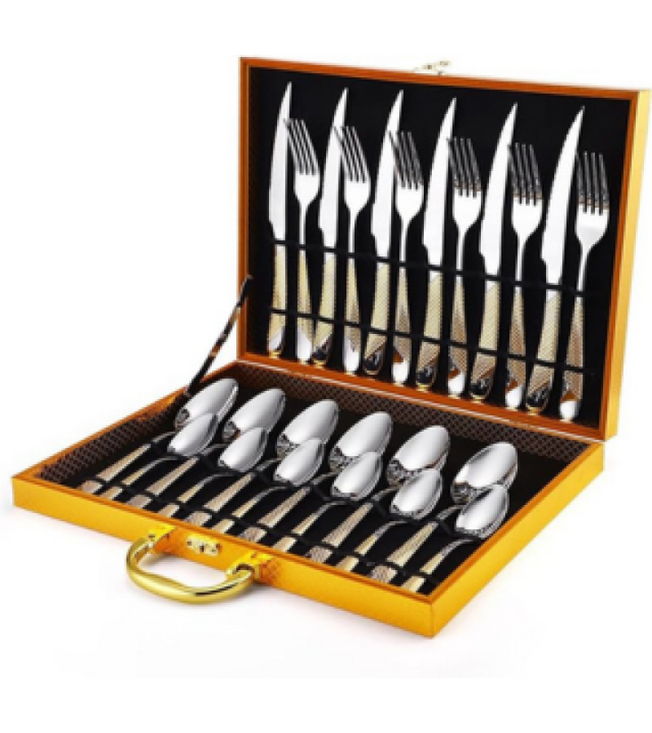 يتميز هذا الطقم بتصميم فاخر وجذاب يضفي لمسة من الأناقة والفخامة على أي إعداد للطاولة، مما يجعله مثالياً للاستخدام في المناسبات الخاصة والعائلية.