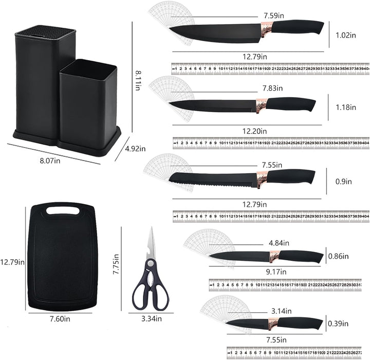 يشمل سكين خبز مسنن (12.8 إنش)، سكين شيف (11.8 إنش)، سكين تقطيع (11.8 إنش)، سكين متعدد الاستخدامات (9.25 إنش)، سكين فاكهة (7.6 إنش)، مقص مطبخ، وحامل لحفظ السكاكين.