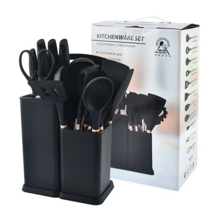 طقم أدوات الطبخ مع 11 ملعقة حرارية مقاومة للحرارة + 6 سكاكين حادة + 2 لوح تقطيع (أسود، طقم 19 قطعة)