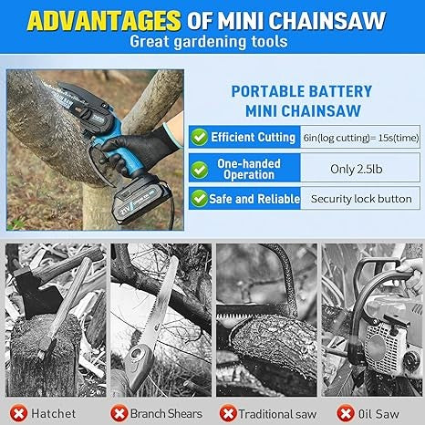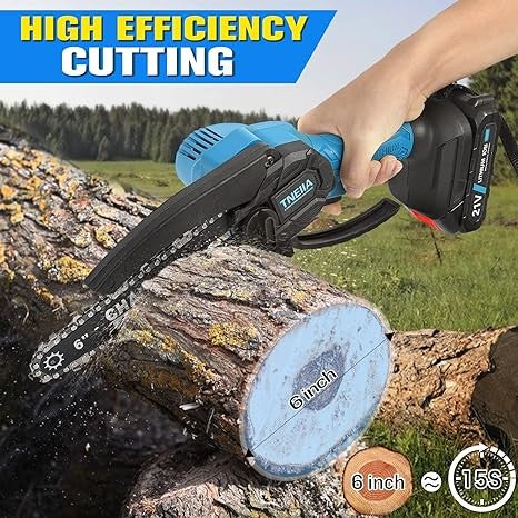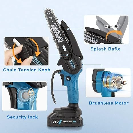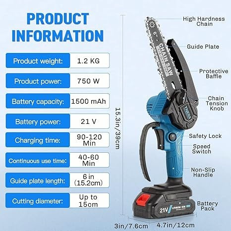 - **حزمة بطارية عالية السعة:** مزود ببطارية ليثيوم قوية بسعة 1500 مللي أمبير في الساعة، مما يوفر عمر بطارية طويل. يمكن للمنشار الجنزيري قطع الفروع بشكل مستمر لمدة 40-60 دقيقة عند الشحن الكامل.